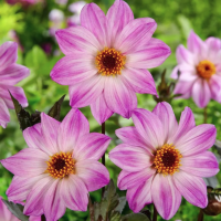 Георгина Бишоп оф Лейчестер (Bishop of Leicester) – воротничковый сорт георгины высотой 70 см. Цветки диаметром до 10 см имеют розовые, неравномерно окрашенные лепестки и коричневую серединку, которая со временам становится яркой золотисто-желтой.
